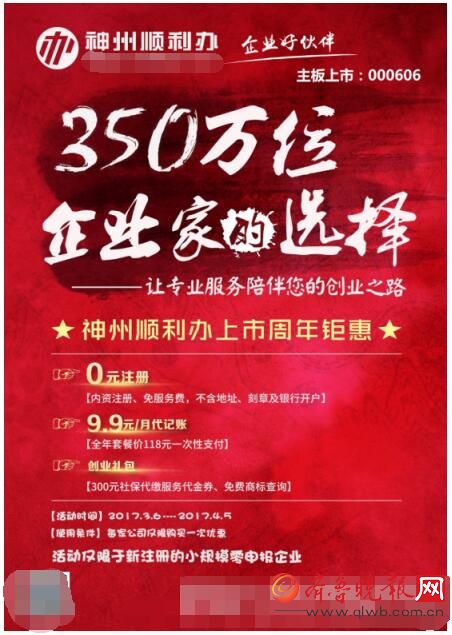 恰在此时,神州易桥旗下品牌一站式企业服务平台神州顺利办,为回馈广大企业用户一年以来的支持和喜爱,宣布在北京地区推出上市周年庆钜惠套餐。即日起至2017年4月5日,原价每200元/月的小规模代理记账服务,现在仅需9.9元/月。史无前例的优惠,击破价格底线,惊喜不仅如此,还送价值520元的内资公司注册和300元的创业礼包,让您花最低价钱享受最优服务,机会不容错过。